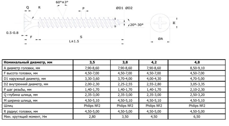 Особенности конструкции: потайная головка и крестообразный шлиц (Ph №2). Частый шаг резьбы - для крепления к металлическим профилям.